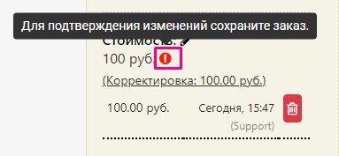Нажмите зелёный значок галочки — введённая корректировка отобразится в истории и будет пересчитана Стоимость заказа: