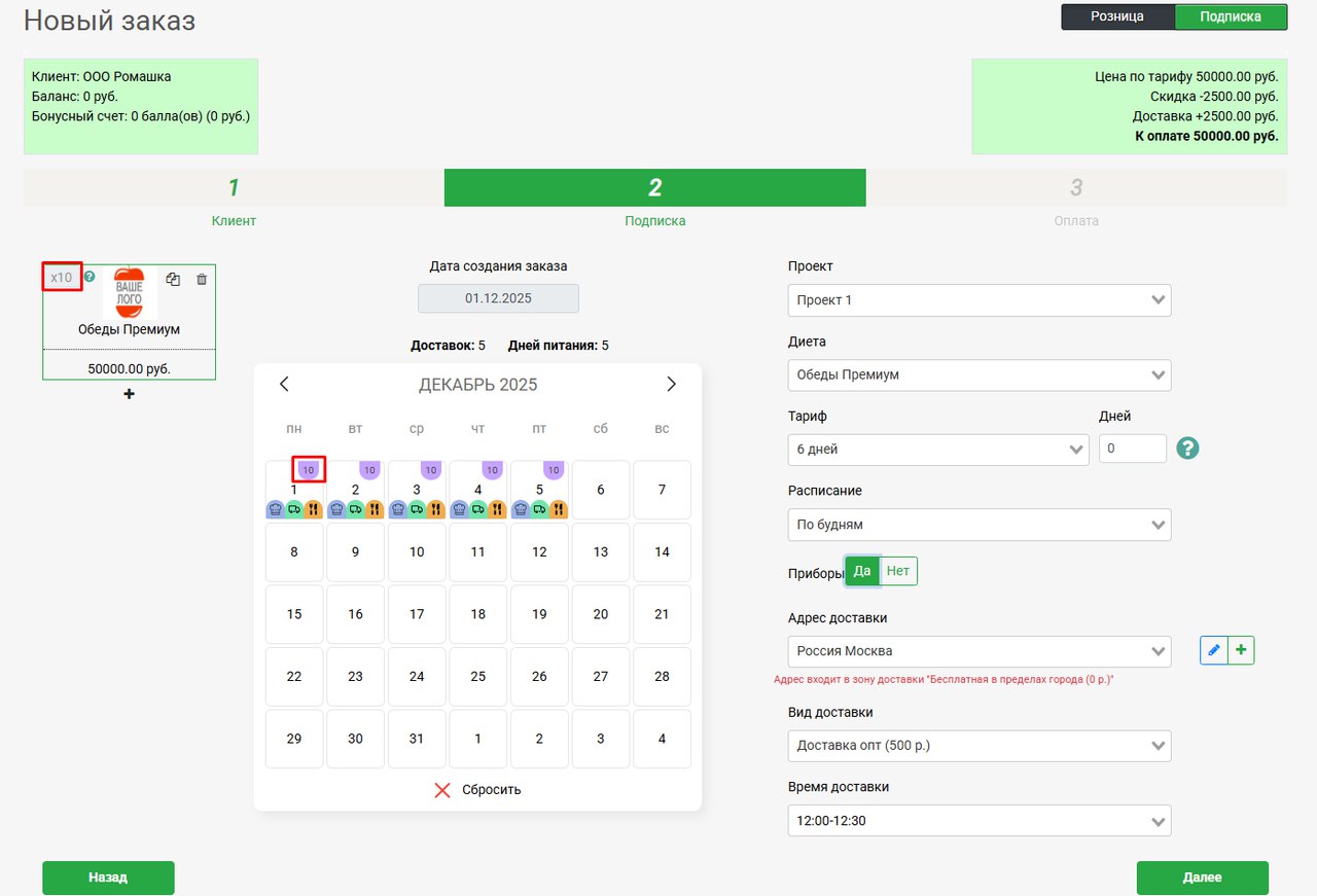 На втором шаге, в карточке подписки (слева) появилось поле «Количество рационов оптом» — введите нужное число ДО создания подписки (например, 10)