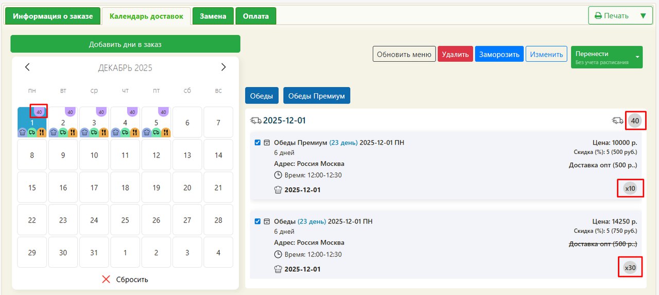 - Изменения на календаре (Изменить, Перенести, Заморозить, Удалить, Обновить меню; ПКМ - Перенести дату доставки/готовки/питания) применяются ко всем рационам в оптовом наборе вместе — нельзя изменить один из рационов отдельно