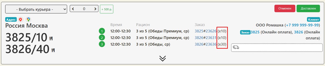 В логистике: количество единиц в оптовом наборе отображается рядом с номерами заказа и рациона (в скобках)