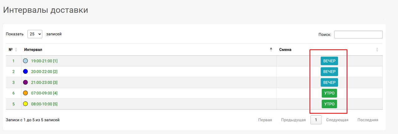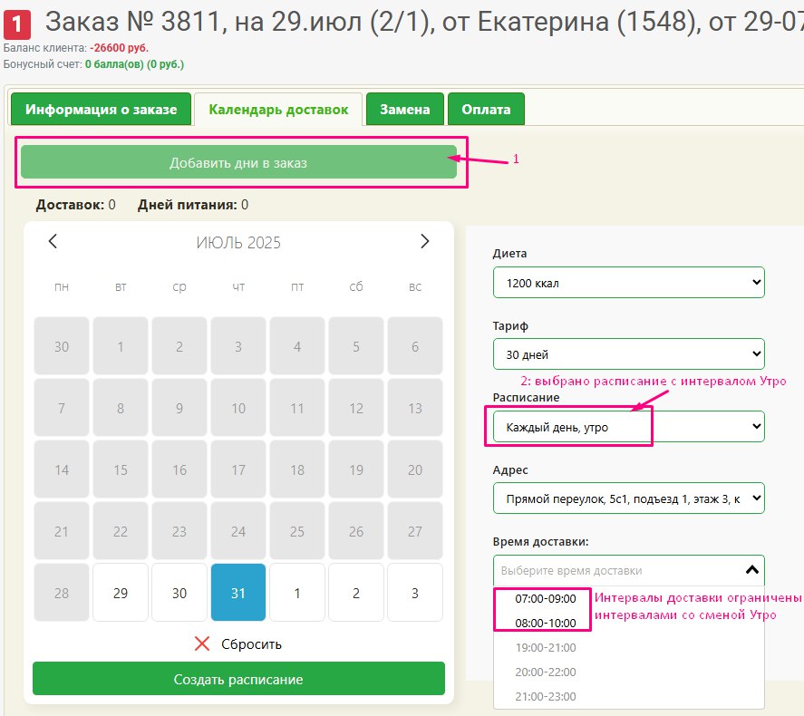 Мы добавили связку времени доставки (утро, вечер) с расписанием доставки.