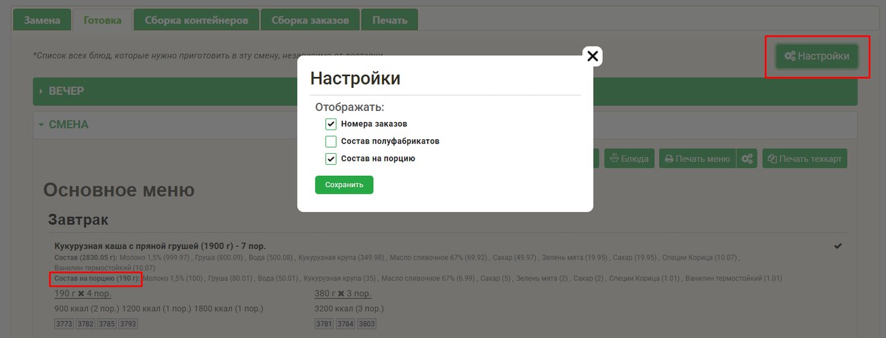 На Производстве во вкладке Готовка сделали кнопку настроек. Туда убрали опцию отображать номера заказов, а также добавили опции отображать состав полуфабрикатов и отображать состав на стандартную порцию, чтобы поварам лишний раз не приходилось смотреть в тех карты.