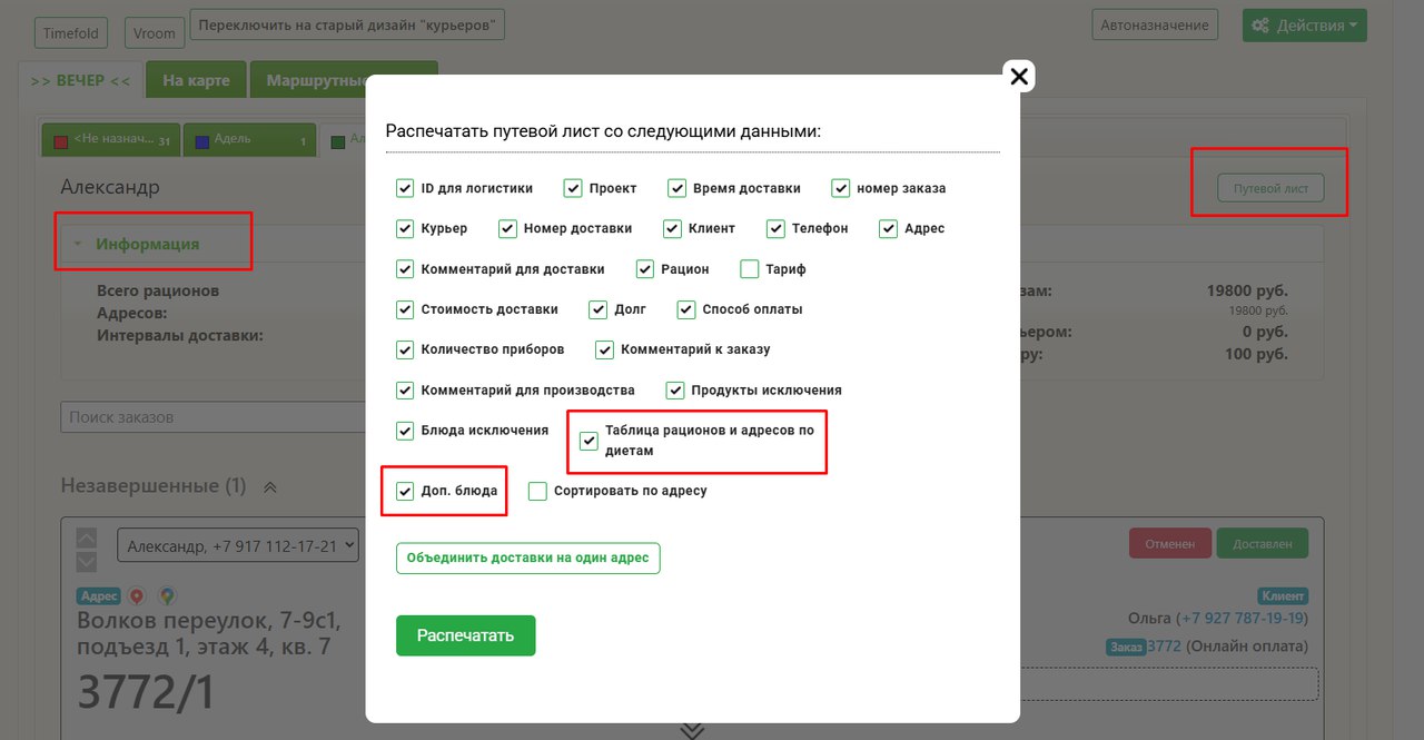 В выгрузку путевого листа курьера добавили колонку с дополнительными блюдами в рационе (сюда же попадут блюда из Розничного заказа) и таблицу всех рационов и адресов по диетам, как в Информации в путевом листе в системе.