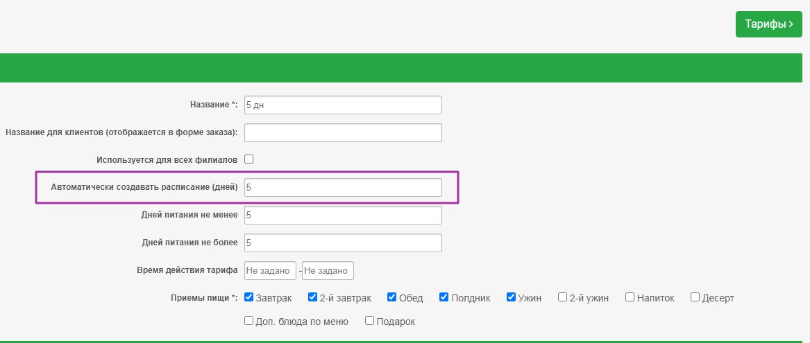 - В Справочники-Тарифы укажите количество дней питания клиента для автоматического создания расписания.