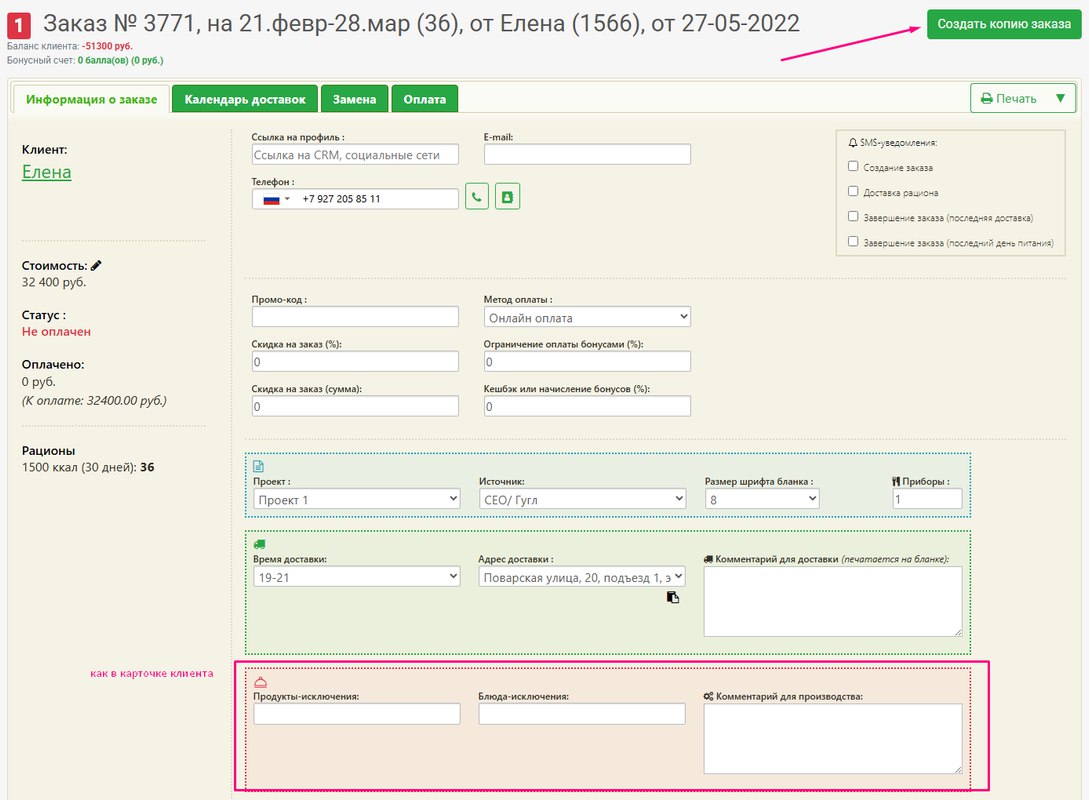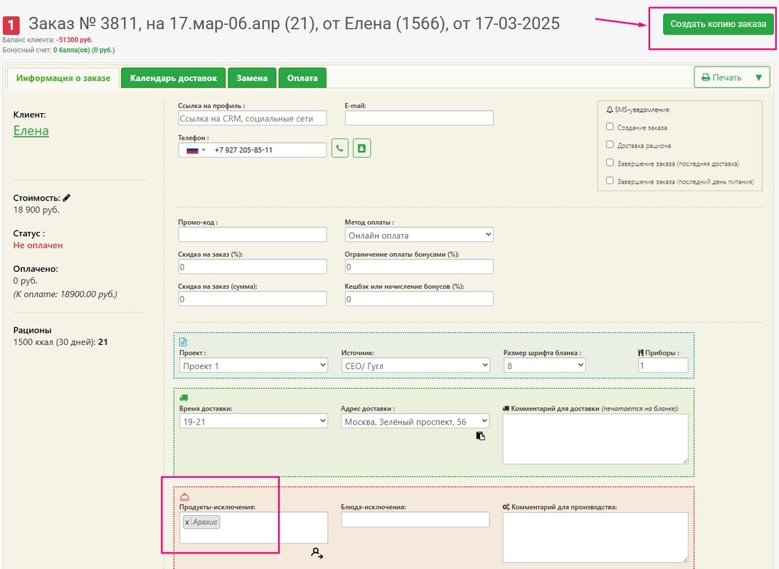 Если нужно создать заказ для её дочери повторно, т.е. нужно создать заказ с теми же исключениями (и комментарием производства) заказа, которые отличаются от исключений (и комментарием производства) клиента, то нажмите кнопку Создать копию заказа на странице нужного созданного заказа: