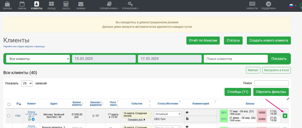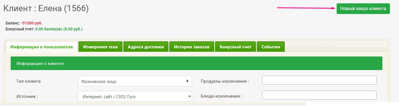 Т.е. по кнопкам создания нового заказа со страницы Клиенты и из карточки клиента (см.скрины ниже) - будет создан заказ с исключениями и комментарием производства из клиента. Остальная информация (диета, тариф, адрес и т.д.), как и раньше, берется из настроек последнего заказа клиента.