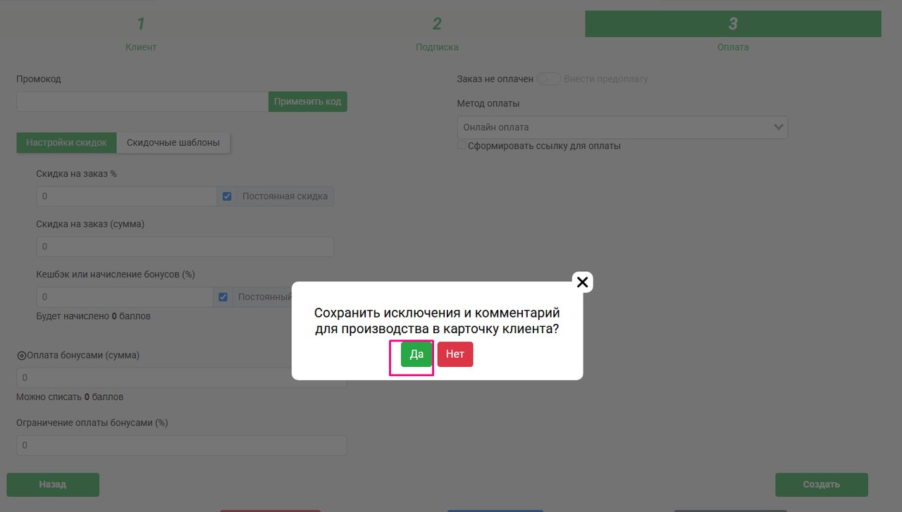 При создании заказа нового клиента или если у постоянного клиента поменялись исключения/комментарий производства, то введите нужные изменения, а на последнем шаге после нажатия кнопки Создать во всплывашке нажмите кнопку ДА - прокинуть изменения в карточку клиента:
