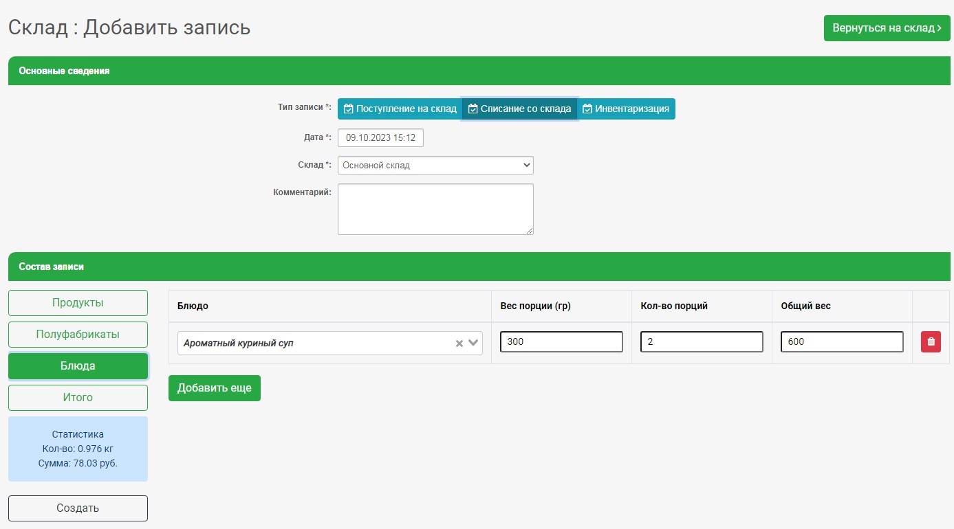 Списание со склада блюд и пф