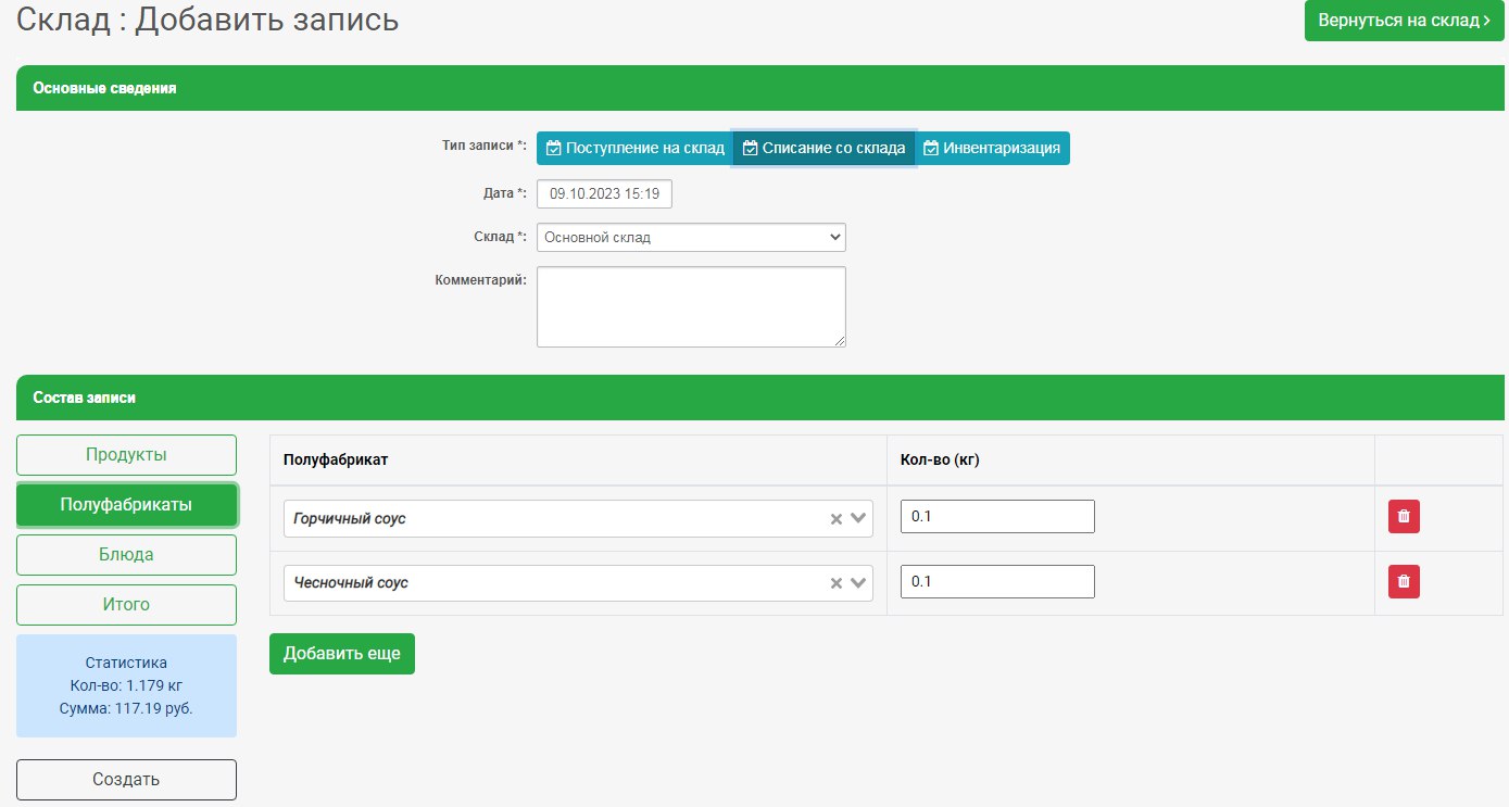 Добавили возможность ручного списания со склада блюд и полуфабрикатов вне смены.