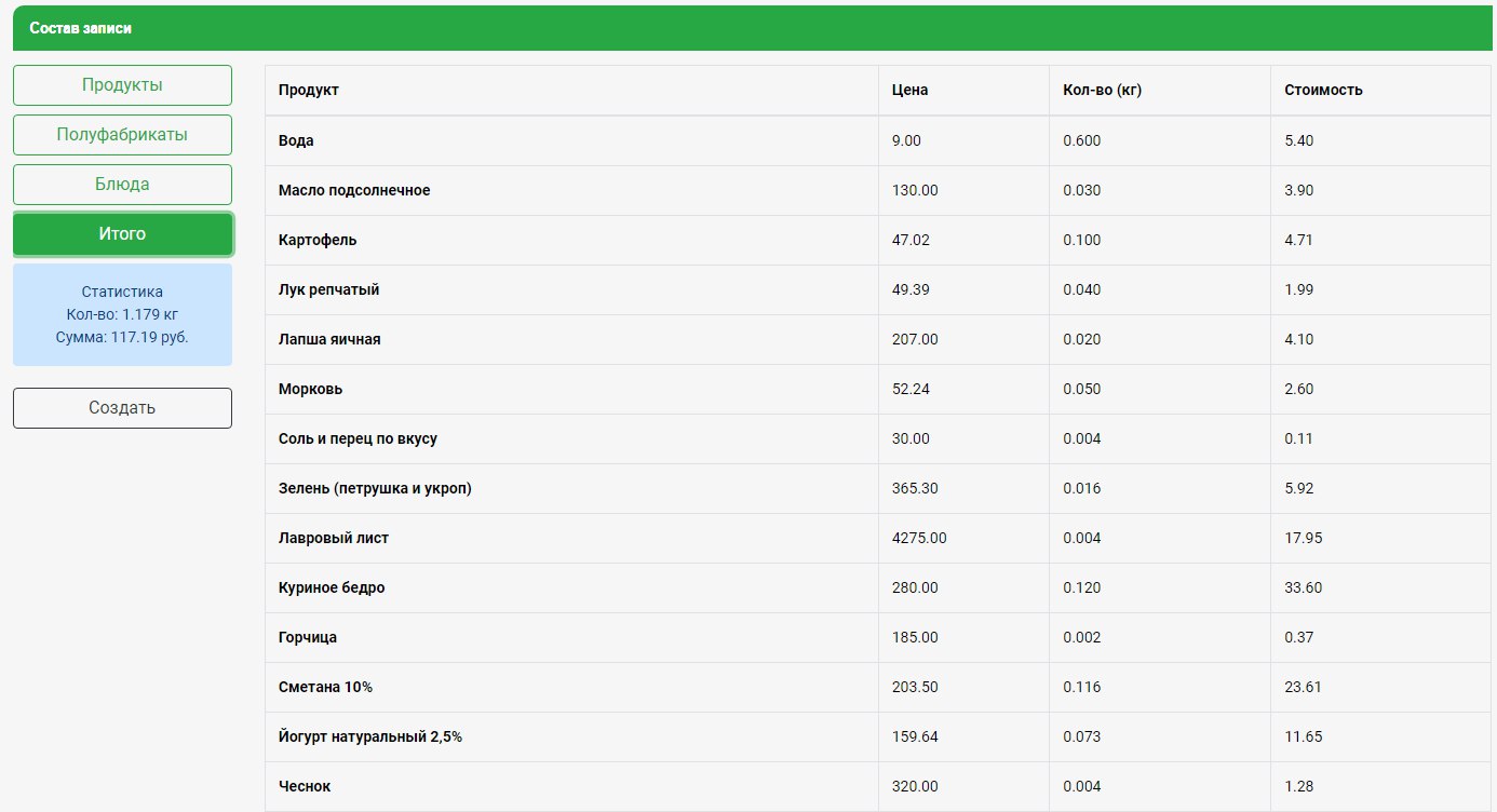 Во вкладке Итого: Итоговый вес и стоимость всех продуктов, включая продукты в составе блюд и полуфабрикатов, в расчёте их количества (кг) в указанном весе блюд и полуфабрикатов.