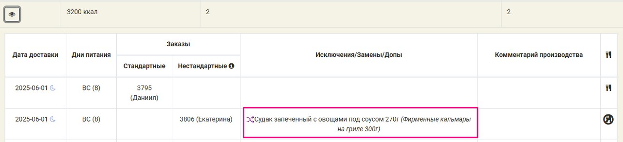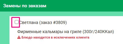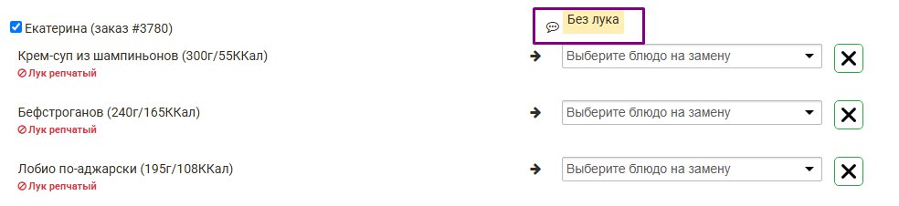 И ещё важное дополнение в блоке Замен по заказам - это наличие комментария производства, подсвечен жёлтым, расположен над боксами блюд-замен: