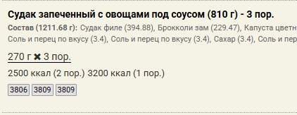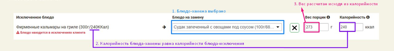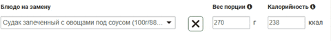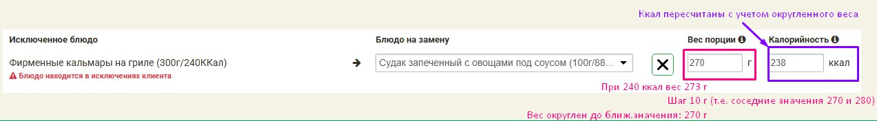Тогда у блюда-замены значение веса будет округлено с учетом шага (отсчёт шага от 0), а ккал пересчитаны: