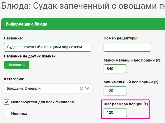 Если используете веса порций с коэффициентами 1,5 и 2, то будет удобно в шаге выставить половину веса базового блюда. На примере того же Судака: базовый вес 240г, выставим шаг 120г (минимальный шаг нужно будет выставить кратным этому значению, т.е. 120г или 240г):