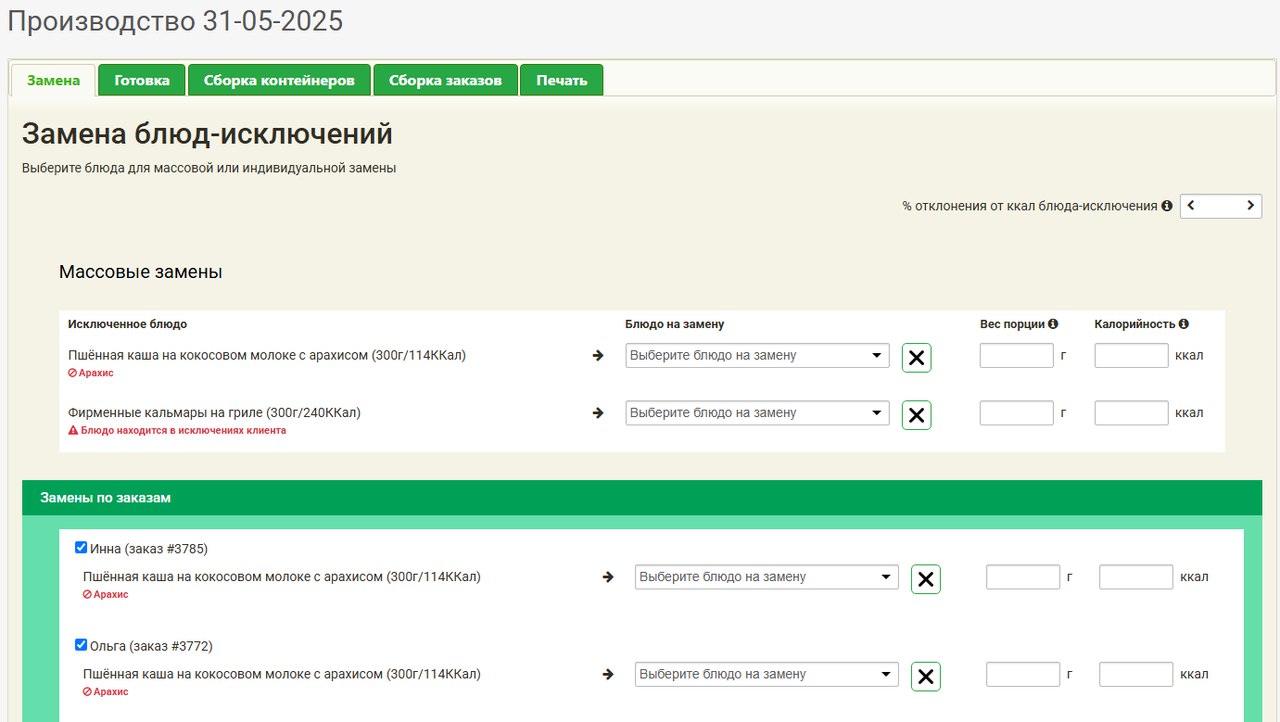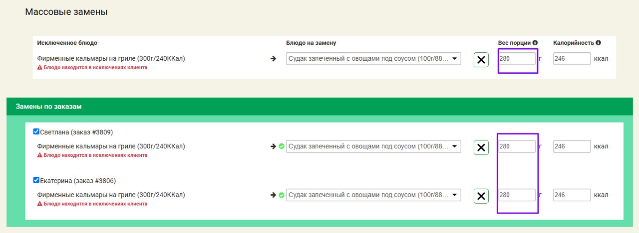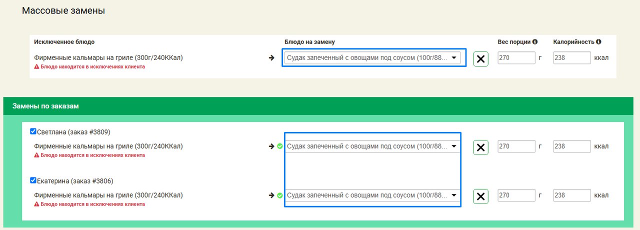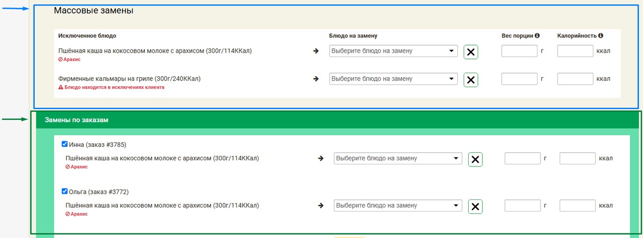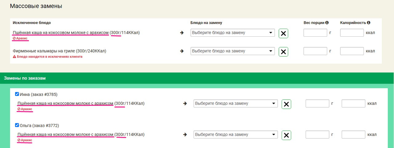 3. Замены разбиты по заказам (нижний зелёный блок). Если есть блюдо с одинаковым названием, весом и исключением в 2х и более случаях - то они сгруппируются для возможности массовой замены в верхнем блоке:
