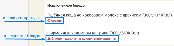 - далее блюда, в которых есть исключение по продукту хотя бы у 1 клиента, имеют пометку (Исключен продукт) [см.скрин ниже: Пшеничная каша и т.д.]