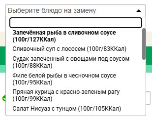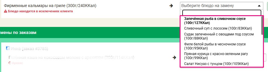 4. Для произведения замены у нужного блюда кликаем по боксу замены, появляется выпадающий список: