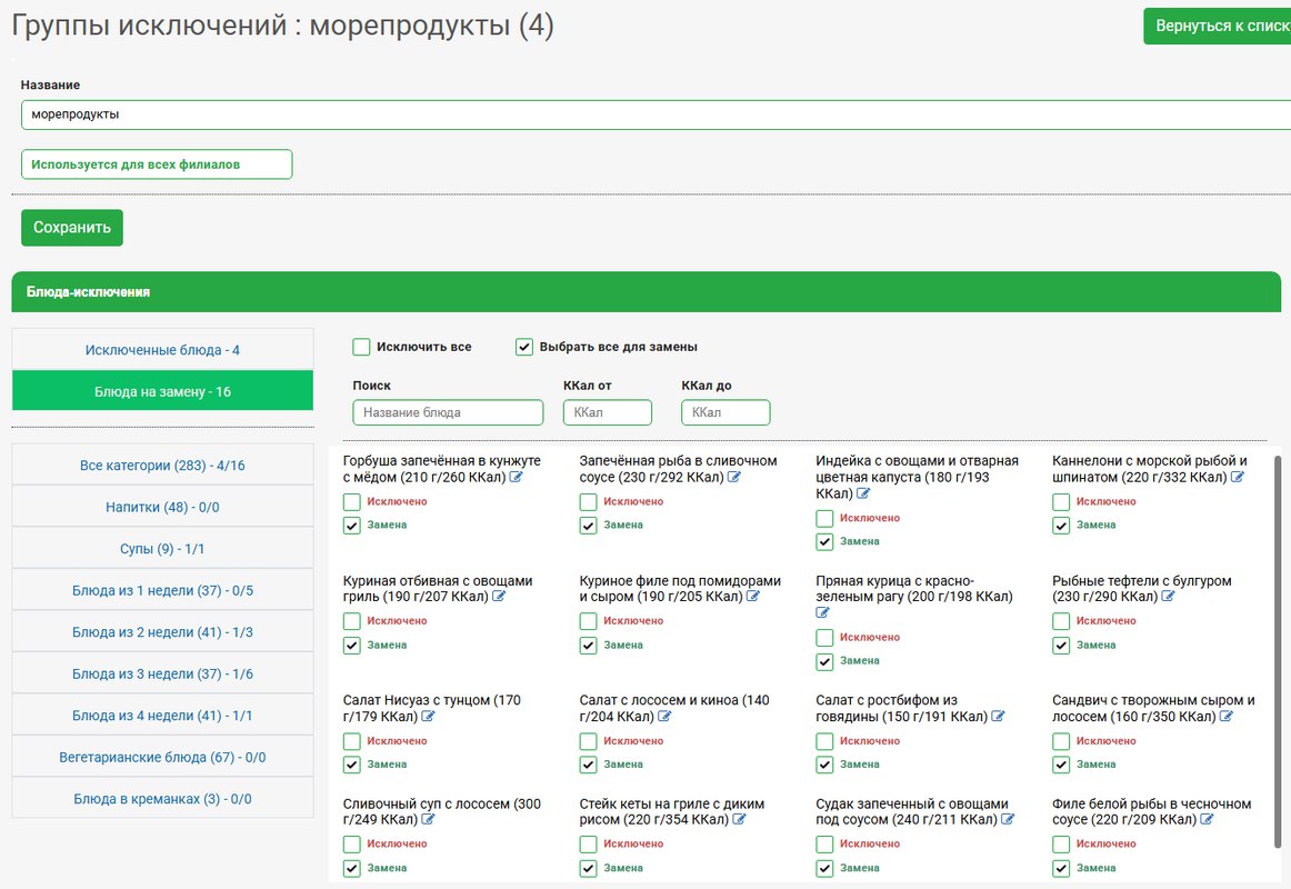 2. Открывается вкладка Замена, на которой отображаются все блюда с исключением по продукту и блюда-исключения, которые готовятся в эту дату: